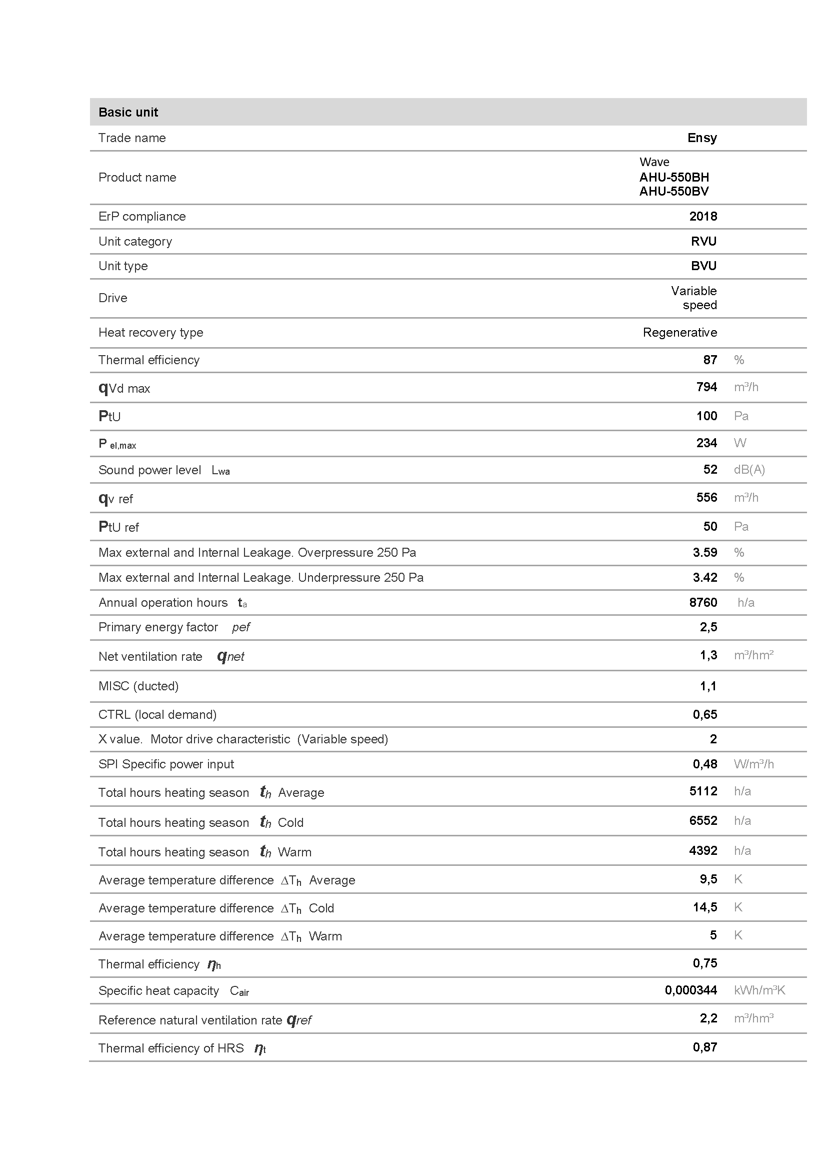 DATOS TÉCNICOS AHU-550 BH y BV
